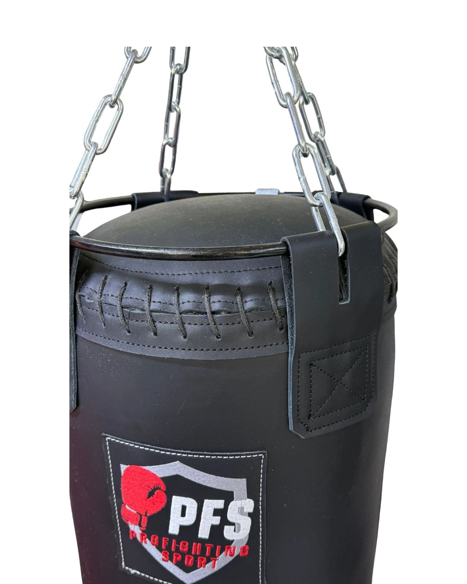 Модель выполнена из натуральной кожи и относится к PRO-серии ProFightingSport. Усиленные швы и кожаные уши крепления рассчитаны на интенсивные тренировки. Внутри плотная набивка ветошью — мешок сохраняет форму и рабочую жёсткость в течение долгого времени.