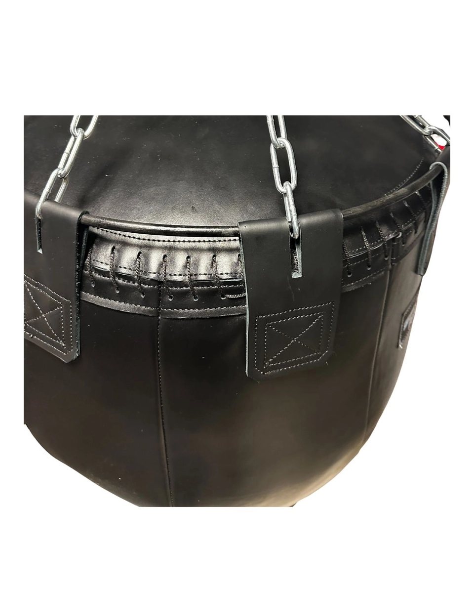 Мешок выполнен из натуральной кожи, имеет усиленные швы и кожаные уши крепления. Внутри используется наполнитель ветошь — держит форму, не превращается в пыль и обеспечивает стабильную плотность. В комплекте идут карабины и цепи, изделие полностью готово к установке.